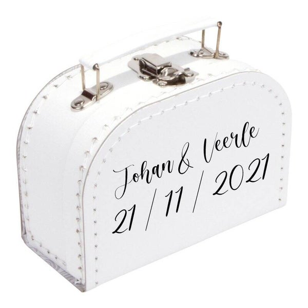 Klein wit koffertje gepersonaliseerd met naam/namen en eventueel datum. Supertof als geschenkje voor een huwelijk.